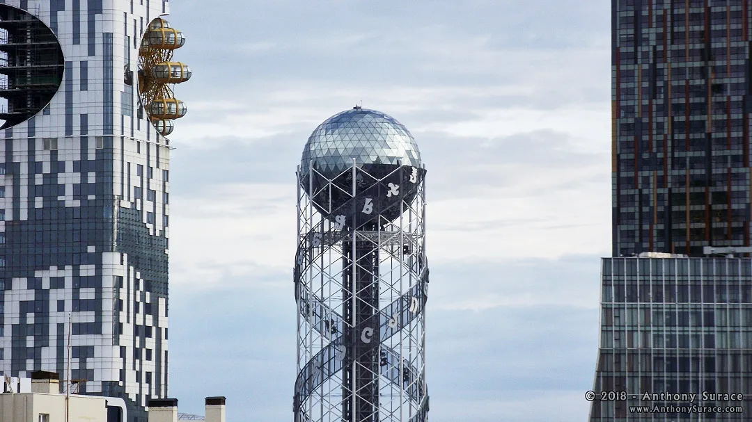 Башня Алфавита высотой 130 метров — памятник грузинскому алфавиту (грузиница), которым картвелы (самоназвание грузин) гордятся как одним из самых древних в мире. Башня построена в виде спирали ДНК: алфавит символизирует генетический код. В нее можно подняться на панорамном лифте, подъем платный — 20 лари (597.8 рублей). Наверху под стеклянным куполом есть бар, ресторан и смотровая площадка. Купол медленно в течение часа делает оборот на 360 градусов.