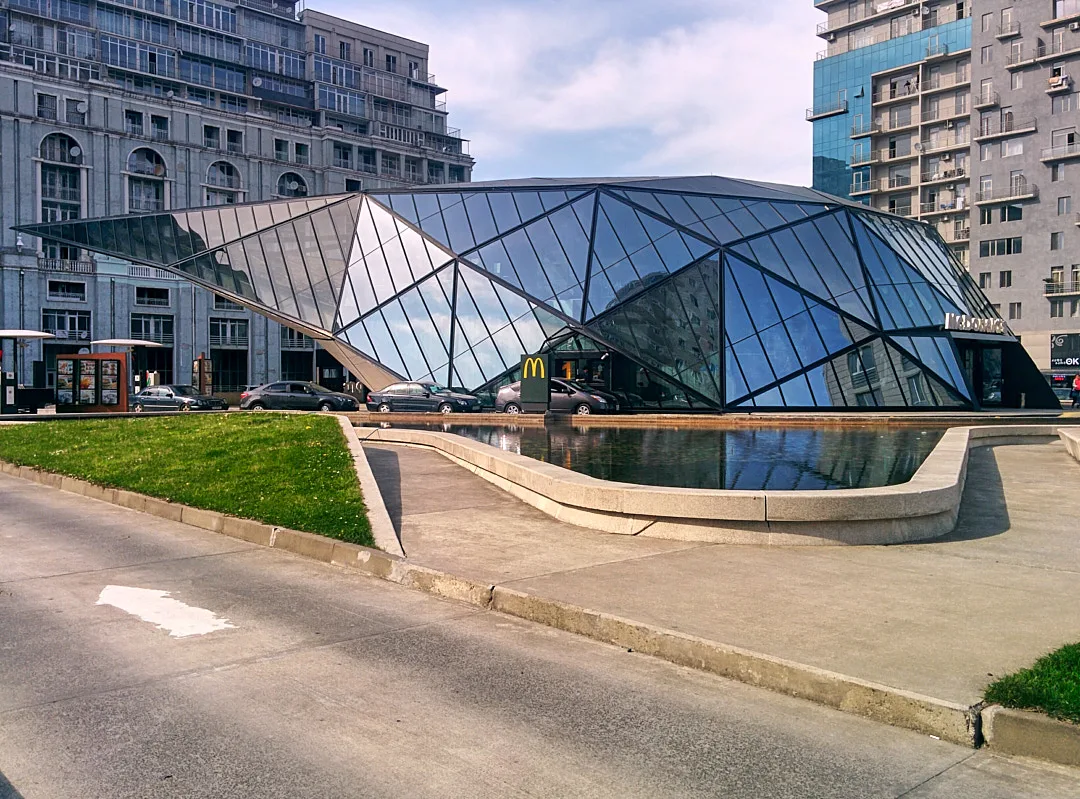 Архитектура «Макдональдса» на улице Химшиашвили в новой части города считается одной из самых оригинальных в мире. Это стеклянное здание с висячими садами, прозрачной крышей и столиками между клумб, часть помещения — крыша для соседней заправки.