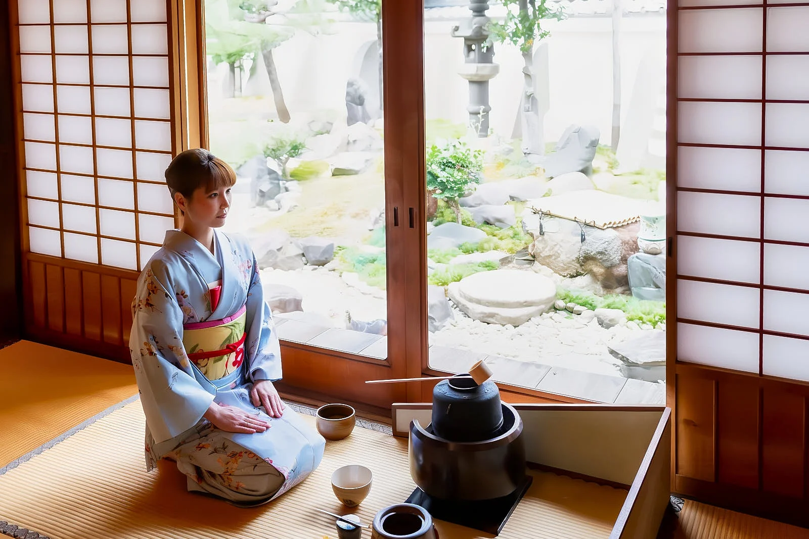 Зелёный чай матча из района Удзи — один из самых древних и известных сортов чайных листьев в Японии. Попробовать его можно как в крошечных лапшичных, так и в храмовых садах. Исторические районы Гион и Хигасияма — родина японской чайной церемонии. Поэтому это идеальные места для посещения чайных домов и знакомства с древним искусством приготовления чая. Во время ритуала, проводимого на татами профессиональным чайным мастером, у вас будет возможность узнать о философии и этикете чаепития, а также освоить основы приготовления матчи. Церемония в чайном домике Ju-An длится около 45 минут. Вначале вам коротко расскажут о чайной церемонии, объяснят назначение чайной утвари, затем гости будут наблюдать процесс приготовления чая мастером школы Урасэнкэ, одной из самых больших чайных школ Японии. Церемония проходит на английском языке. Возможны три варианта церемонии: общая чайная церемония стоит 2700 иен (1353 рублей), в стоимость включены сладости и два вида зеленого чая. Частная чайная церемония — 5400 иен (2706 рублей). Короткая 20-минутная церемония стоит 1000 иен (501.1 рублей).