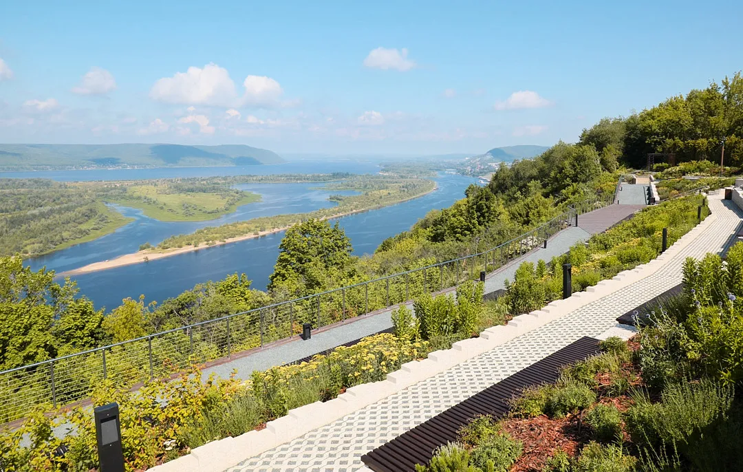 Не переправляясь на другой берег, можно подняться на Лысую гору. На ее вершине большая опушка с видом на Волгу и Самару. Из центра ходит автобус №50, без пробок ехать около 1,5 часов, в час-пик — 2–2,5 часа. Выходим на остановке «Дачи» и спускаемся к Волге от светофора. Возле пляжа есть указатели — ориентируемся по ним и забираемся на Лысую гору. На велосипеде или машине можно добраться до Тип-Тяв — самой высокой среди Сокольих гор (продолжение Жигулевских гор). В ней находится «Красноглинский холодильник» — бывшее подземное хранилище, которое разрешено посещать только с экскурсией (сейчас приостановлены). Если поедете на велосипеде, скачайте заранее треки. На окраине поселка Управленческий (самарцы говорят просто Управа) находится смотровая площадка «Вертолетка». В советское время здесь действительно была площадка для вертолетов. Отсюда открывается панорамный вид на Волгу и речные острова. В 2021 году смотровую реконструировали: вдохновившись московским «Зарядьем», сделали гравийные дорожки и деревянные настилы, высадили декоративные кустарники, установили минималистичные лавки, подключили необычную подсветку. Теперь здесь можно поваляться в шезлонге, посидеть в небольшой беседке или покататься на качелях в тени перголы. Из центра города на «Вертолетку» можно доехать на такси или на автобусах №50 и №1 — нужно выйти на остановке «Поселок Управленческий» и идти пешком в сторону Волги.