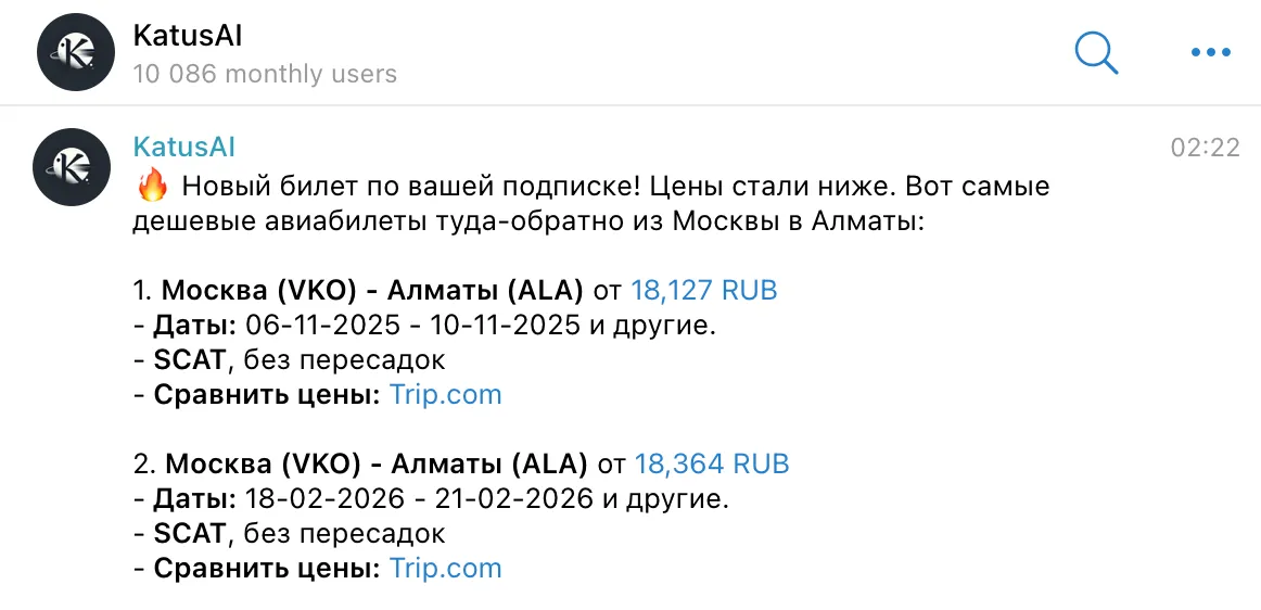 20 евро (11744 тенге / 1810 рублей) — минимальный бюджет на день в Алматы 🇰🇿. Этого хватит на неплохой хостел, две поездки на общественном транспорте и еду (обед и ужин в недорогих кафе). Эта сумма не включает стоимость перелета и страховки. Билет туда-обратно из Москвы можно найти за 20-25 тысяч рублей. Воспользуйтесь нашим ИИ-ботом @katusaibot в «Телеграме», чтобы найти дешевые билеты. В нем можно искать билеты сразу в Алматы или хоть сразу во все города Казахстана. Он понимает почти любые запросы, а еще в нем в 3 клика можно сделать подписку на снижение цены, так что вы сможете первым узнать, когда билеты в Алматы подешевеют на ваши даты.