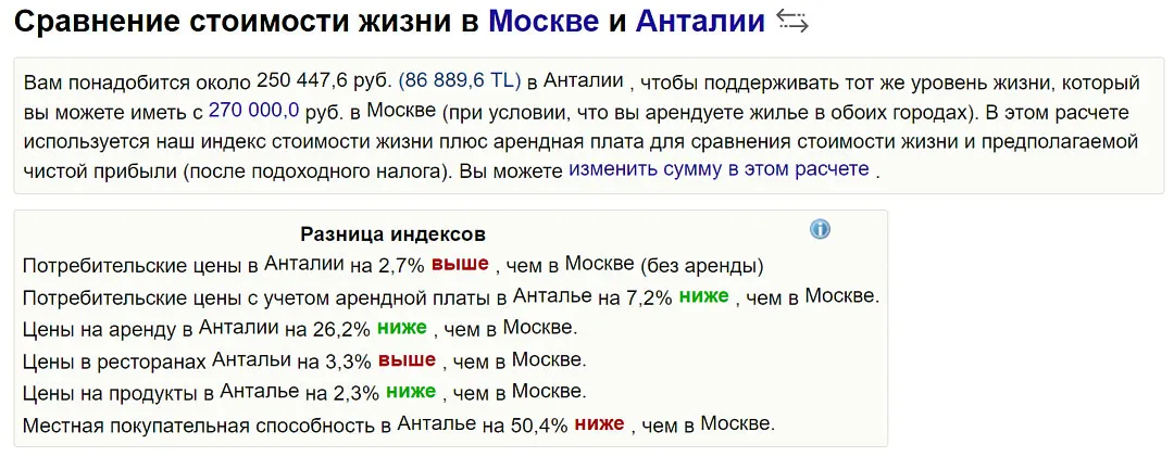 Цены в Анталии в частности выше московских. Еда в кафе и ресторанах выше на 3.3%, а цены в супермаркетах ниже всего на 2.3%. Подробнее на numbeo.com.