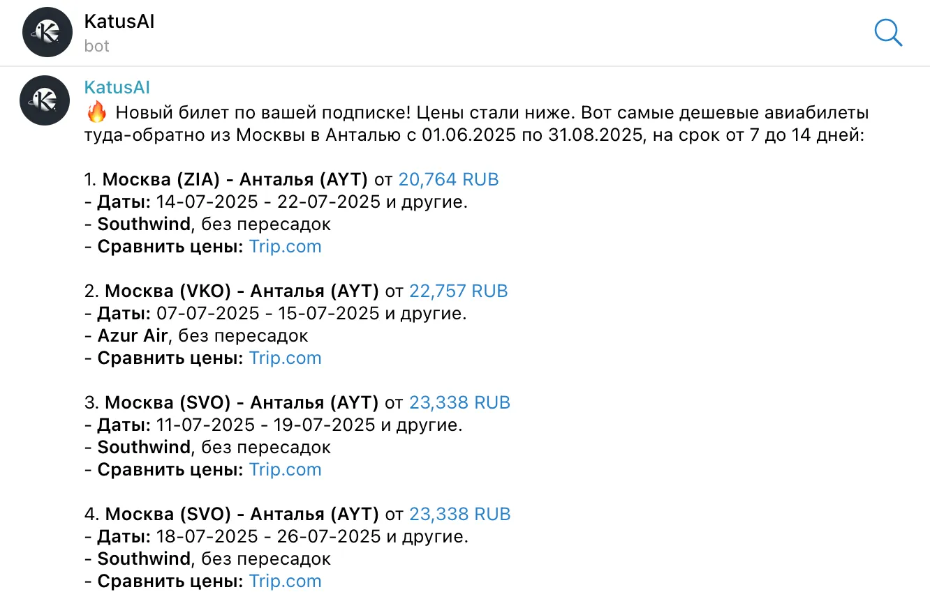 25 € (1296 турецких лир / 2263 ₽) – минимальный бюджет на день в Анталии 🇹🇷. Этого хватит на неплохой бюджетный хостел, две поездки на общественном транспорте и еду (сумма равная двум обедам в недорогих кафе). Эта сумма не включает стоимость перелета и страховки. Билет туда-обратно из Москвы в Анталью будет стоить около 20 000 рублей в обе стороны в летний сезон (а в низкий и того дешевле). Воспользуйтесь нашим ИИ-ботом @katusaibot в «Телеграме», чтобы найти такие дешевые билеты. В нем можно искать билеты сразу во все города Турции или все города России из Антальи. Он понимает почти любые запросы, а еще в нем в 3 клика можно сделать подписку на снижение цены, так что вы сможете первым узнать, когда билеты в Анталью подешевеют на ваши даты.