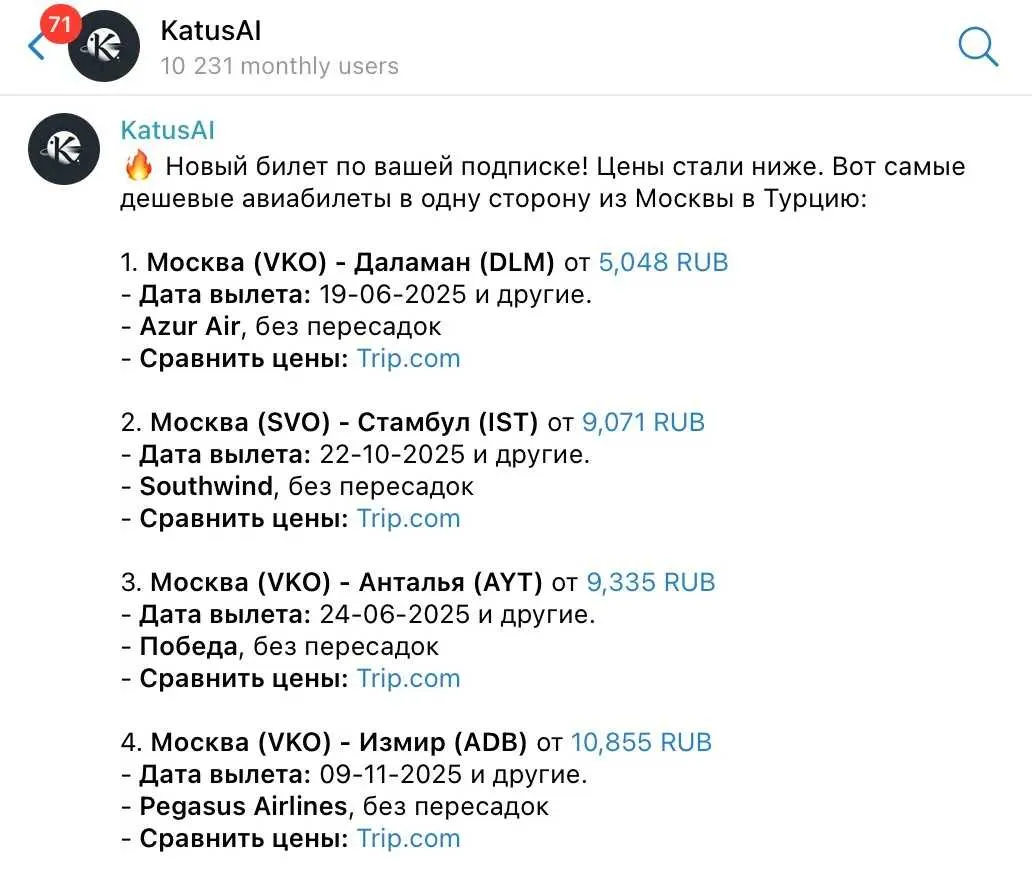 Эта сумма не включает стоимость перелета и страховки. Билет туда — обратно из Москвы будет стоить около 20 000 рублей, иногда может и дороже, а в несезон можно улететь без багажа и за 10 000 в обе стороны. Воспользуйтесь нашим ИИ-ботом @katusaibot в телеграме, чтобы найти дешевые билеты. В нем можно искать билеты сразу во все города Турции и сразу из всех городов России. Он понимает почти любые запросы, а еще в нем в 3 клика можно сделать подписку на снижение цены, так что вы сможете первым узнать, когда билеты в Стамбул подешевеют на ваши даты.