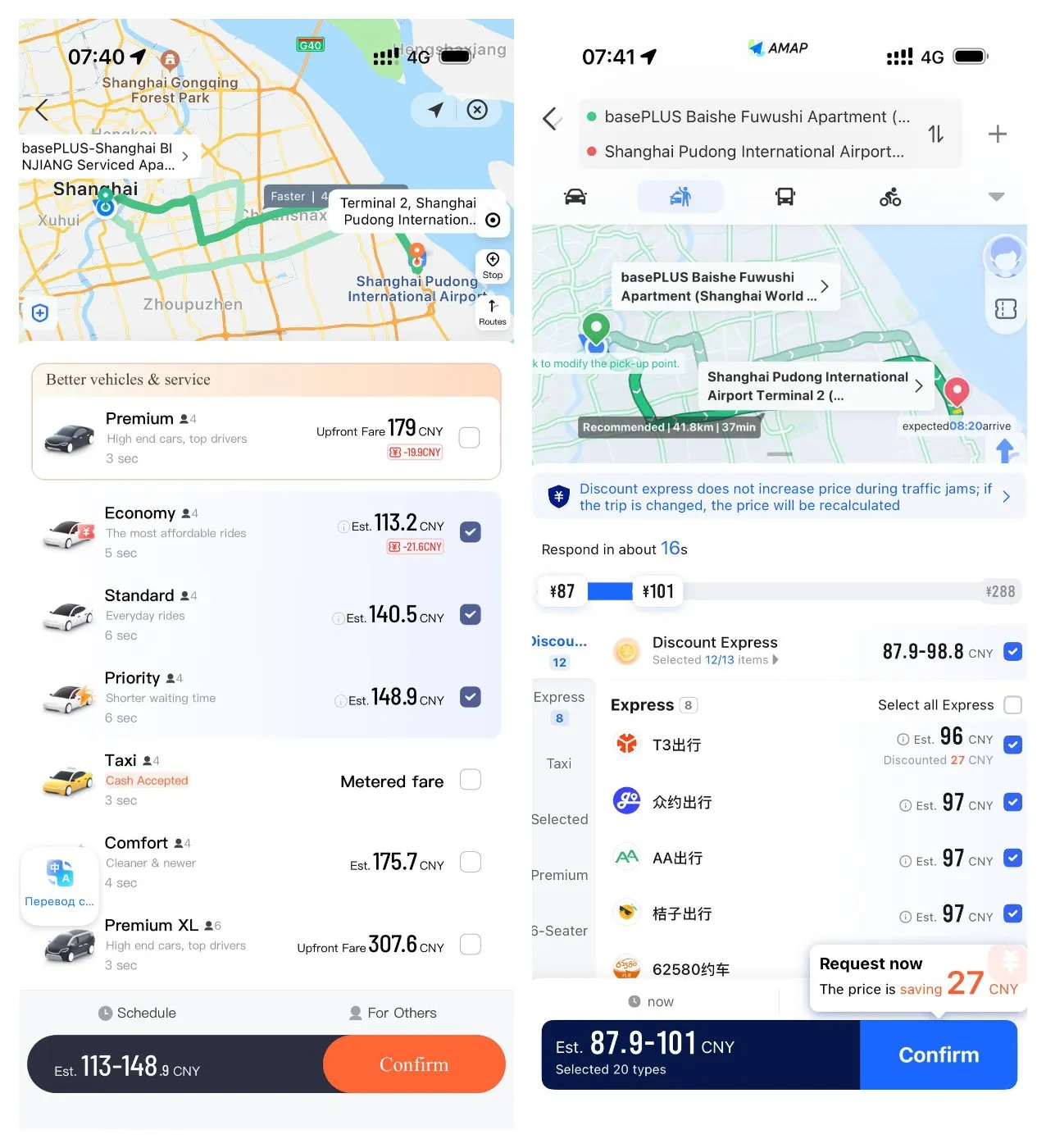 В Didi есть несколько классов машин. Самый дешевый (Express) стоит 14 юаней (166.4 рублей) за поездку до трех километров. Далее — 2,7–3,2 юаня (32.1–38 рублей) за километр в зависимости от времени суток. В комфорт-классе (Premier) поездка стартует от 18 юаней (213.9 рублей) и от 3,2 юаней (38 рублей) за километр. А вот аналог российского бизнеса (Luxury) стартует от 40 юаней (475.4 рублей) и 5–7 (59.4–83.2 рублей) за километр. Ночью и в часы пик поездка может стоить дороже в два раза. При езде по платным дорогам их надо оплачивать отдельно. 40-километровая поездка из аэропорта Пудун до района Французская концессия обойдется в 180–250 юаней (2139–2971 рублей).
