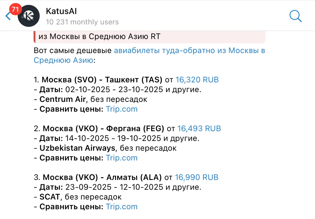 15 долларов (182461 узбекских сумов / 1160 рублей) — минимальный бюджет на день в Ташкенте 🇺🇿. Этого хватит на неплохой бюджетный хостел, две поездки на общественном транспорте, обед и ужин. Эта сумма не включает стоимость перелета и страховки. Билет туда–обратно из Москвы иногда можно поймать за 15 000–20 000 рублей в обе стороны. Из других российских городов цены могут быть ниже чем из Москвы и Санкт-Петербурга. Воспользуйтесь нашим ИИ-ботом @katusaibot в «Телеграме», чтобы найти дешевые билеты. В нем можно искать билеты сразу во все города Узбекистана или все города Средней Азии. Он понимает почти любые запросы, а еще в нем в 3 клика можно сделать подписку на снижение цены, так что вы сможете первым узнать, когда билеты в Ташкент подешевеют на ваши даты.