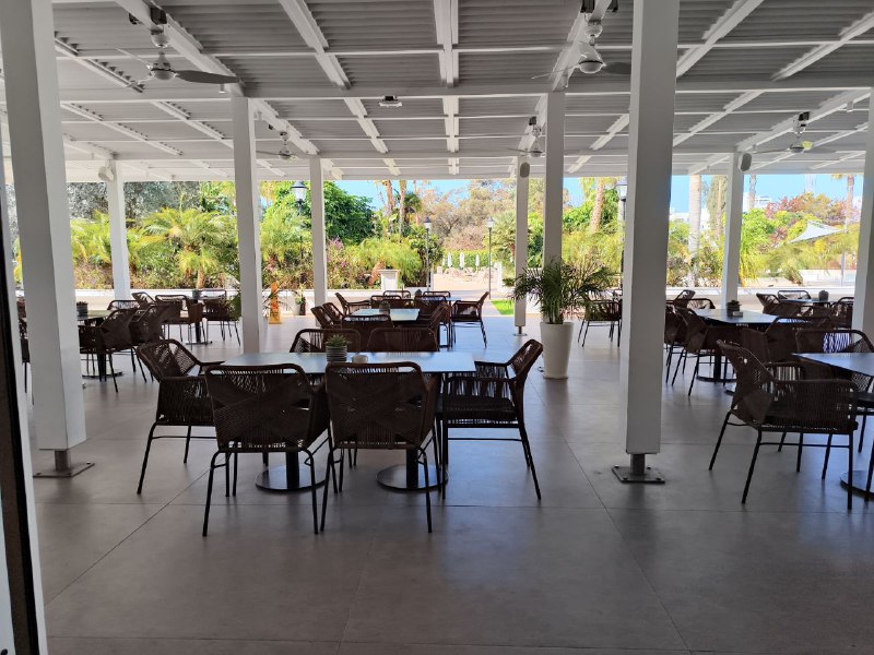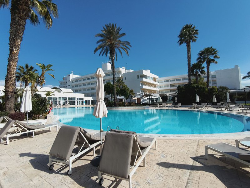 Интерьер — вроде дерево, вроде мрамор, вроде дорогой холл. Даже как бы уличный бассейн. Первые минуты я ещё верю в пять звёзд.