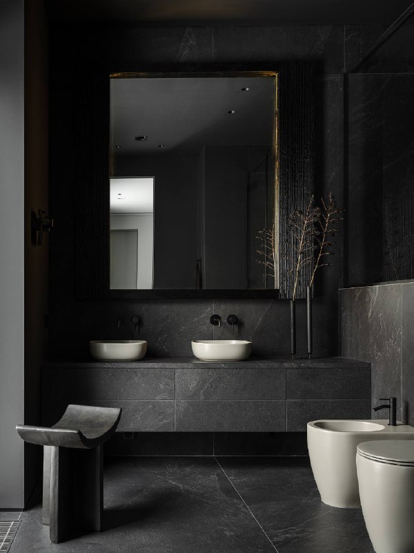 🔸Важной частью проекта стали предметы, которые дизайнеры создали в соавторстве с дизайнером Сергеем Карташовым. Напольное зеркало, скамья из вакуумированного дуба, обеденный стол с рельефными краями и металлическая консоль. Все объекты обладают самобытным характером и создают контраст со строгой геометрией архитектуры.