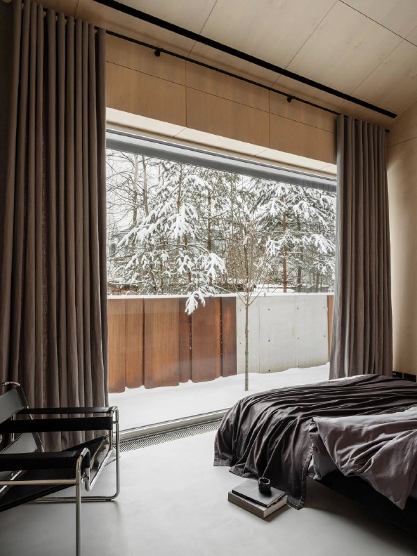 🔸Проект выполнен в сочетании древесных и металлических фактур с нейтральной черно-белой палитрой. Сдержанная основа позволяет искусству выйти на первый план. «Здесь нет демонстративных жестов: пространство напоминает черно-белый фильм — чистое полотно для спокойной загородной жизни, наполненной дорогими сердцу моментами, проведенными с близкими».