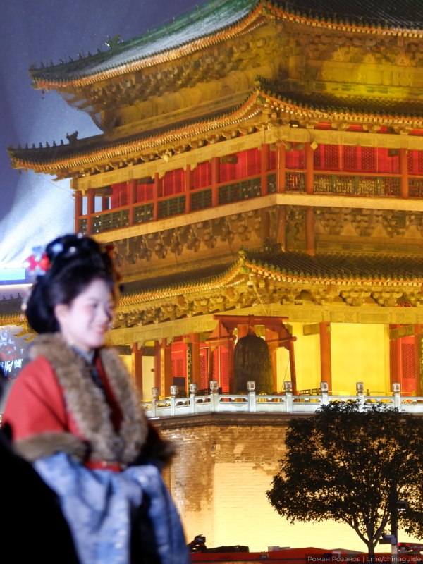 Когда в Сиане пошёл снег, у Колокольной башни тут же выстроились десятки китаянок в национальных костюмах. Сразу с причёсками, макияжем и фотографами, как будто снег был по расписанию. Очень красивое зрелище, хоть и забавное, учитывая его массовость.