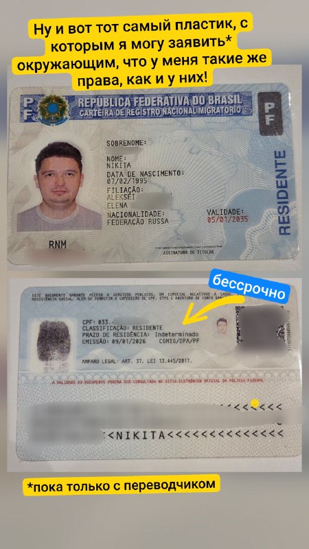 Напомню, что для получения гражданства, одно из условий - это прожить в #Бразилия один год после получения ВНЖ (выезжать можно, но дни вне Бразилии не идут в счёт). И вот с даты, указанной на карточке (а у нас указано 9 января), и начинается отсчёт этого самого года.