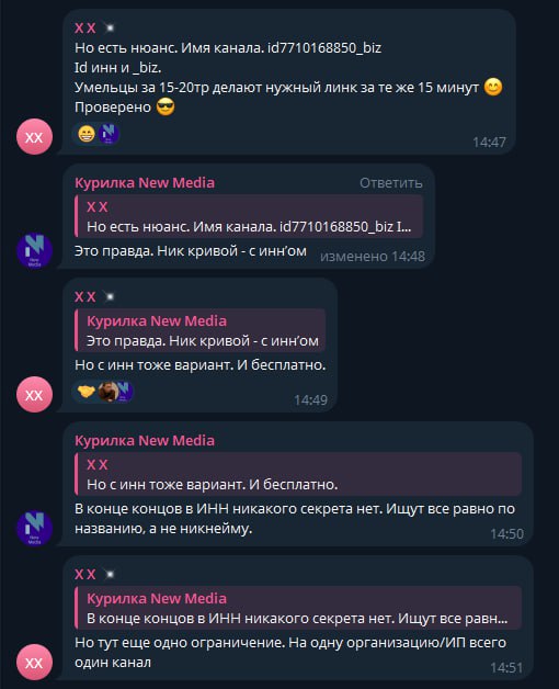 А кто ещё может? Ипэшники и юрлица. Но какими-то мудоёбскими окольными путями. Зато даже дрочить 10к в Телеге для этого не надо. А ещё в юзейрнейме канала будет id7716458811_biz, где цифры — это ваш ИНН. Секьюрно? Безусловно. Каждый подписчик может вбить его в Яндекс и увидеть ваше ФИО. А если у него вдруг есть парочка баз под рукой... ох, С Е К Ь Ю Р Н О. Можно ли сделать так несколько каналов? Нет. Один бизнес — один канал. А зачем вам столько?