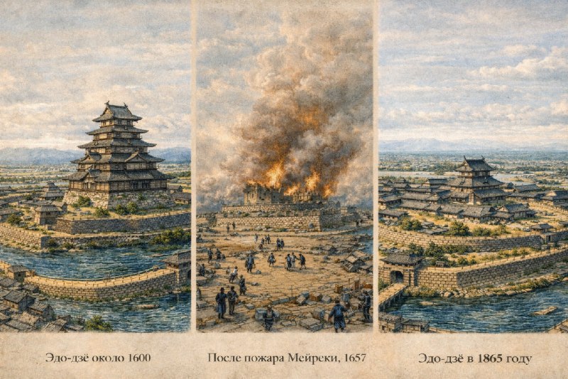 Но не могло всё идти так гладко. Великий пожар Мэйрэки 2-4 марта 1657г. уничтожил ~60% города и унёс жизни 100 000+ человек. Сухая погода, сильный ветер и тесная деревянная застройка помогли распространению пожара, и именно тогда и сгорела главная башня замка. После чего ее решили не восстанавливать, а сэкономленные деньги ушли на перестройку города.