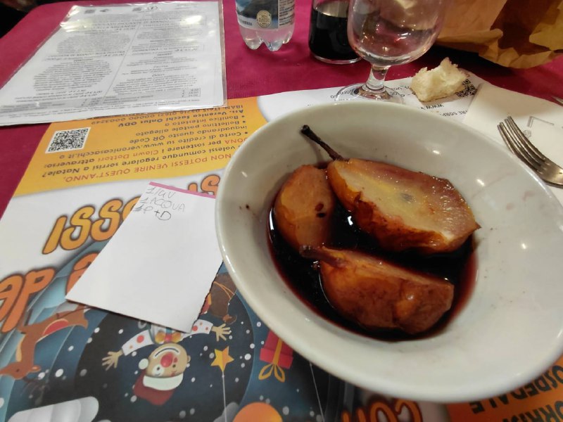 В Италии лучше не рисковать с secondi. Ну не имеют ни хрена готовить: ни мясо, ни рыбу. Так что ограничился primo: лазаньей. Слушайте, вкусно! Почти так же вкусно, как в Будапеште, в забегаловке на Мориц Жигмонде. На десертик взял грушу в красном вине с корицей. Хорошо! Залил это графинчиком красного и эспрессо. Вышло 17 евронов с копейками, что для Италии - сильно бюджетно.