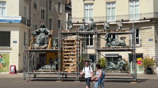 Оригинальные скульптуры XIX века (центральная фигура Нанта и аллегории Луары с притоками) демонтировали для реставрации. Вместо них установили не скучные и бездушные леса, а 14 гиперреалистичных фигур современных жителей города, обычных людей XXI века. Старые статуи при этом не исчезли – их разместили рядом в конструкции, напоминающей музейное хранилище. Получился этакий диалог эпох. Ну круто же, согласитесь?? И к фонтану дополнительное внимание привлекает, и реставрации не мешает, и о-очень необычно! 🤩