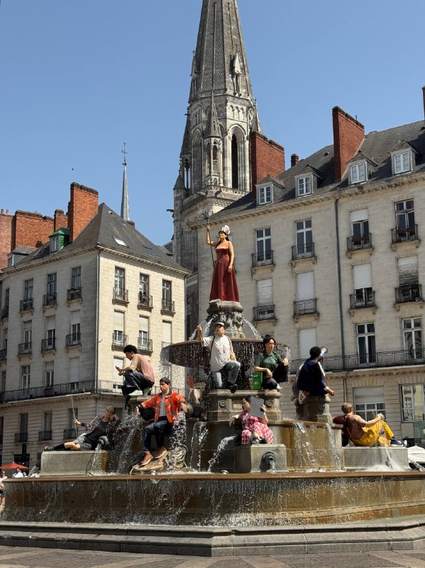 В 2025 году в рамках ежегодного фестиваля Le Voyage à Nantes на фонтане появилась инсталляция Latest Version, ее вы и видите на фото и видео поста. Именно здесь мы впервые почувствовали необычность Нанта. *Сейчас фонтан уже должен был вернуться к прежнему состоянию, так что ехать и искать его не торопитесь!