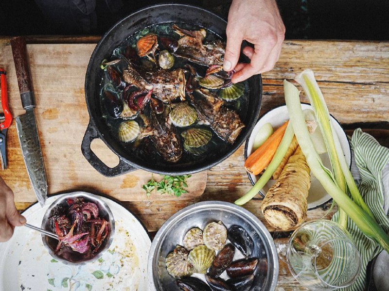 «Есть два варианта приготовления шкары: так, как её готовят в Греции и на Балканах, просто на решётке, и так, как её готовят в Крыму — в собственном соку, с луком и травами. Я объединил оба способа, а ещё добавил дикие мидии и черноморского гребешка. Ракушки раскрываются при тепловой обработке и отдают морскую воду. Она придаёт блюду тот самый вкус, ради которого мы иной раз готовы ехать через полмира», — делится Иван.
